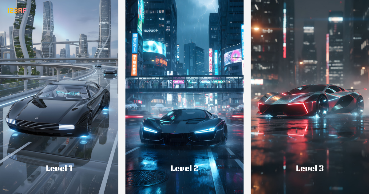 - Rezultat: U ovom slučaju slika već ima jasan stil i atmosferu. 123RF generator pravilno prepoznaje pojmove cyberpunk i rainy.