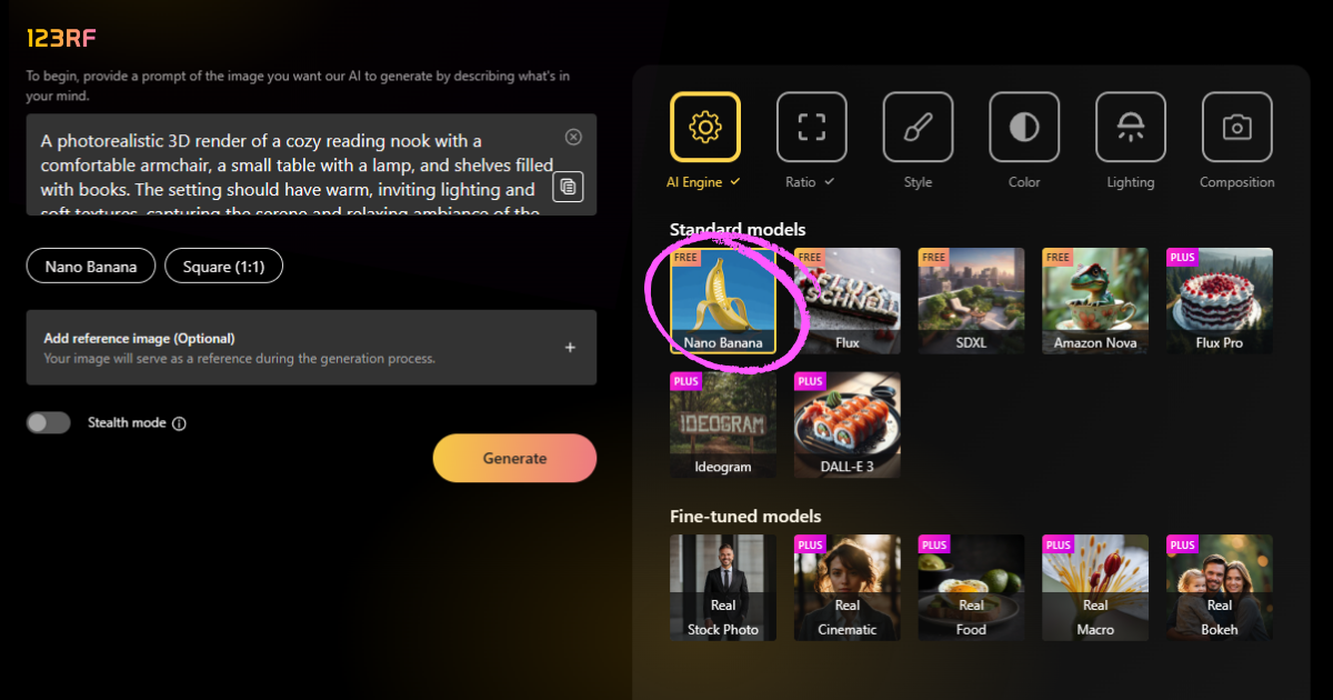 Otvorite 123RF AI Image Generator, izaberite Nano Banana model i započnite kreiranje već danas.